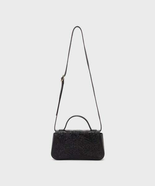 横長シルエットのショルダーバッグ。上質な牛革に、中心に向かって花が咲くように施した新しい柄が美しく映える一品。金具をなるべく少なくしてシンプルな見え感にし、カジュアルなコーディネートにも合わせやすいように作りました。ブラックとタンブガッティの色展開をご用意した、カービングらしいヴィンテージ感のあるデザインに仕上げました。ショルダーを外してハンドルバッグとしても使える嬉しい2WAY仕様です。