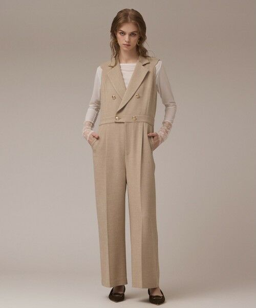 ネップ調のサマーツイード素材でお作りしたテーラードサロペット。 さらっとした着心地で、一足早く秋の気配を感じさせつつ真夏から着て頂ける一枚に仕上げました。センタープレスを入れたゆったりとした大人ハンサムなストレートシルエット。テーラード型に大きなゴールドのメタルボタンがアクセントに効いた、アーバンムード漂う一着です。一枚でおしゃれに決まる、ワードローブの新定番。暑い時期はこのまま一枚で、涼しくなったらロングスリーブやハイネックを中に添えてと、長い期間楽しめるアイテムです。
