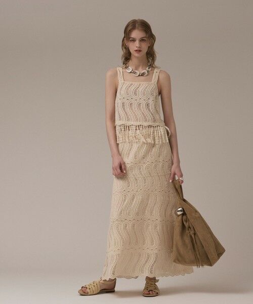 インポートならではの美しい素材を活かした、BOHOな雰囲気薫るクロシェレースのキャミソール。トルコのBROCHE(ブロチェ)社のコットン100%のクロシェレースを贅沢に使用。曲線を描く大胆なキカ柄にレースと揺れるフリンジを組み合わせた、大人っぽさとフェミニンなムードが美しく調和したデザインです。ヘルシーなノースリーブ型にスマートなスクエアネックで、夏らしい涼し気な一枚に。お揃いのスカートを合わせる事で、ワンピース風の着こなしもお楽しみいただけます。