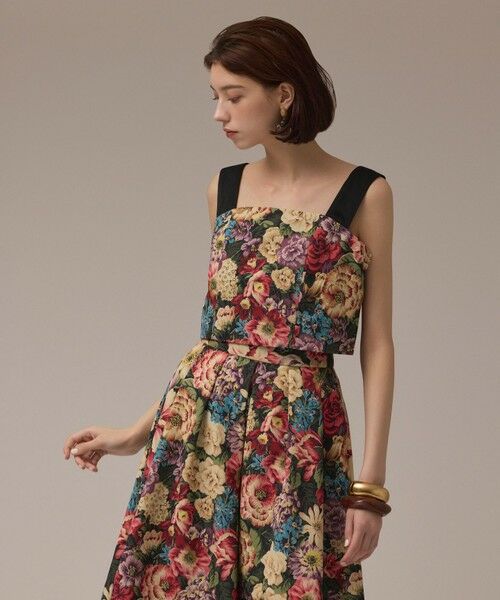 アンティークムード漂う美しいフラワー柄が一際目を惹くベアトップス。やや太めに設定した締め色の肩紐が全体をぴりっと纏め、大人っぽさと洗練感を両立。そのまま1枚で着たり中にインナーを添えたレイヤードスタイルを楽しんだりと、様々な着回し楽しめるのも魅力です。お揃いでお作りしたスカートとセットアップで着る事で、ワンピース風のコーディネートも可能。多色使いの華やかなレッドとモノトーンで纏めたシックなブラックの2色をご用意しました。