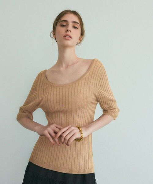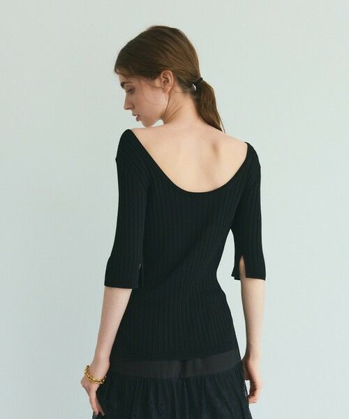 光沢感が綺麗なヴィスコース系のリブ編みニットプルオーバー。 晩夏から初秋にかけて着やすいハーフスリーブに、後ろ衿ぐりを大きく開けた女性らしいバックオープンデザイン。体に張り付きにくくさらっとしていて着心地が良いのも、愛用率を高めてくれるポイントです。袖にスリットを入れて抜け感をプラスし、一枚でさらっと着ておしゃれに決まる一枚に仕上げました。サイドの裾にもスリットを入れる事で体に張りつかず、またリブが広がって見えない為綺麗を保ちつつ着て頂けます。一枚着としてはもちろんの事、ベストやジャケット、キャミソールワンピースなどの中に、困ったときのインナーとして重宝するアイテムです。