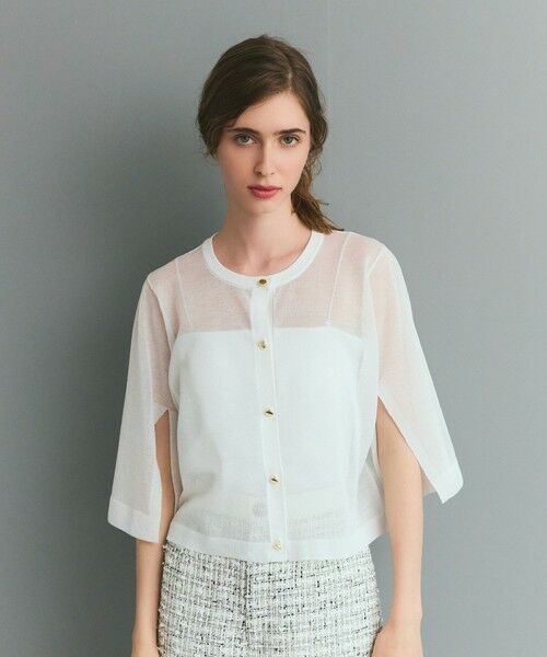 軽やかに羽織れる涼やかなシアー感が魅力のカーディガン。レーヨンポリエステルのドライタッチな糸で丁寧に編み立てた、晩夏から初秋にかけて便利に使えるアイテムです。手元の動きが綺麗に見えるスリットスリーブで、女性らしい抜け感をプラス。小さなメタルボタンをトッピングしてアーバンムード漂う一枚に仕上げました。肩にさらっとかけて、ケープのように羽織った着こなしもおすすめです。