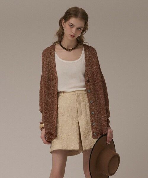 ラメが美しく煌めく、大人のカジュアルスタイルに品よく溶け込むニットカーディガン。リネンを思わせるようなシャリ感と軽さ、そして清涼感が特徴のペーパー混の素材を使用しラメ糸と引き揃えて、ほんのり華やかさと女性らしいニュアンスを表現しました。繊維に適度な隙間があるため通気性が良く、また吸水・吸湿性に優れているため暑い時期もべたつかずに着やすいのが魅力。ヒップがしっかりと隠れるミドル丈のややルーズなシルエットは、イージーパンツ、スカートやショートパンツなどどんなアイテムともバランス良く合わせていただけます。素材を引き立てるシンプルなデザインが、合わせる装いに悩まずスマートに馴染むポイント。晩夏〜秋に使いやすい落ち着きのあるカラー展開をご用意しました。