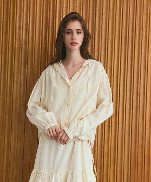 インポートならではの美しい素材をふんだんに使用した、ブルゾン・シャツの2WAYで着用できるラグジュアリーなフーディー。フランスDEVEAUX(デヴォー)社の柔らかで程よいシアー感のある、ラメチェックジャガード地を使用。存在感のある金のラメ糸が美しく煌めく、リュクスな佇まいが魅力の一着です。シャツ感覚でさっと羽織れる涼しい素材ながらも秋の気配を感じさせてくれる、スイッチシーズンにぴったりな一品。高級感のある生地をあえて裾ドロスト仕様にしフーディーに落とし込んだ、大人のカジュアルスタイルに溶け込むデザインです。お揃いでお作りしたキャミドレスをあわせたワンランク上のコーディネートもお勧めです。