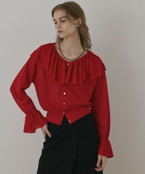 華やかなフリルが目を惹くニットカーディガン。レーヨンブレンドの合繊素材でお作りした、ほのかにシアー感があるさらっとした着心地のスイッチシーズンにぴったりな一枚です。生地を贅沢に使用したボリューミィな首周りのフリルに、腕の動きにとって揺らぐキャンディースリーブが可憐なアクセントに。深みのある大人なレッドと、上品な大人のコーディネートにぴったりなブラックの2色をご用意しました。