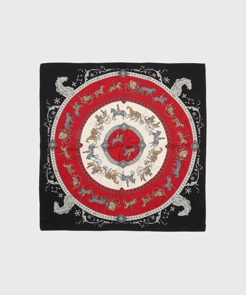 【Japan Fabric】日本製のシルク100%のツイルを使ったハンドプリントのスカーフ。 繊細なタッチでホース柄を描いた、ヴィンテージ感のあるオリジナル柄がポイントです。黒と赤と白のコントラストが美しく調和した一品。胸元や腰で巻いたり、Gジャンに肩掛けしたりと旬な装いをぜひお楽しみください。