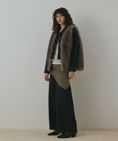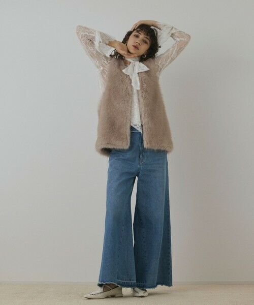 リアルなフォックスファーと見間違えるような、グラデーションの差し毛が美しいフェイクファーベスト。 アウターとして華やかに着ていただける様、クラシックで大人なムードのあるフォックスフェイクファーを選定。毛足が長く、密度がしっかりあるラグジュアリーな雰囲気漂う一着です。ですが、程よいボリュームに抑えた事で着膨れせずにすっきりと着て頂ける一枚に仕上げました。ニュアンス感のある大人なカラーもポイント。素材を活かしたノーカラー・ボタンレスのシンプルなデザインで、合わせる装いに悩まずさらっと軽く羽織れるデザインに。Tシャツやシャツ、デニムなどのいつものスタイルにばさっと重ねるだけで、特別感のある大人の装いをお楽しみ頂けます。