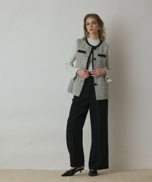 シーズナブルな装いを楽しめる、クラシカルな雰囲気漂うツイードベスト。繊細に煌めくラメ糸の入ったモノトーンのツイード素材を使用した、上品で華やかな表情が魅力の一枚です。縁取りにスラブ調の生地を切り替え、ビジュー刺繍を丁寧に施したリュクスな佇まい。可憐なペプラムシルエットにする事で、気になるヒップ周りを自然とカバーしてくれるのも大人に嬉しい点です。そのまま着て頂くのはもちろんの事、中にハイネックニット添えたり、お揃いでお作りしたワンピースとの新鮮なセットアップスタイルもおすすめです。