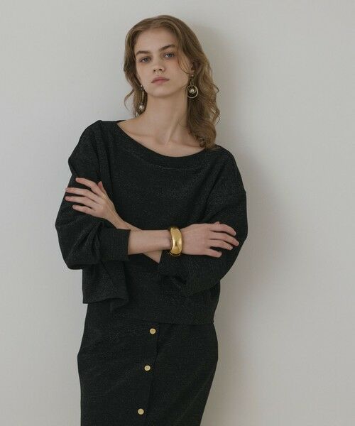 シンプルで着合わせやすい、オフショルダーのトレーナートップス。繊細なラメと身幅にゆとりを持たせた少し丸みのあるリラックスシルエットが美しく調和した、女性らしい表情の一枚です。カジュアルなジャージ素材を使用しつつもハリ感のある布帛のアムンゼンのような梨地調の綺麗めな素材のお陰で、ラフに傾きすぎない品のあるデザインに仕上げました。短すぎない程よいショート丈にする事で、お揃いでお作りしたスカートとバランスの良いセットアップスタイルを楽しめるようにしています。肩を落とした着こなしや袖をたくし上げて手首を覗かせふわっとさせた、こなれたスタイリングもおすすめ。バックネックにはDiagramのメタルプレートをさりげなく飾り、アーバンムード漂うデザインに。シックな大人の装いを楽しめるブラックと今季注目のブラウンの2色をご用意しました。