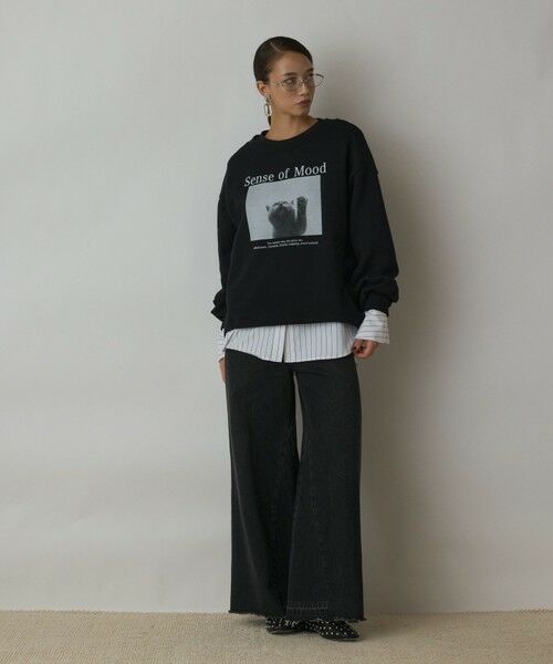 【Japan Fabric】 見上げた猫ちゃんの表情がとびきりキュートな裏毛トップス。Diagramの為にフォトグラファーが撮り下ろしした愛らしいイラストに、思わず微笑んでしまう一着です。フォトに合わせて「そんな気分」といったニュアンスを表す「Sense of Mood」や猫の習性を表現するようなテキストもポイント。ふんわりと柔らかく肌触りの良いジャパンメイドの綿100%裏毛素材を使用。衿ぐりは女性らしいボートネックで抜け感のある表情に仕上げています。袖のボリューム感やシルエットにも拘り、着るだけでニュアンスの出る一枚。パンツでカジュアルに纏めるのはもちろん、チュールスカートなどの女性らしいアイテムを合わせたり、ボウタイブラウスをレイヤードしたり、レースインナーなどを添えて衿元や袖口からレースを覗かせたりと、様々な着回しをぜひお楽しみください。