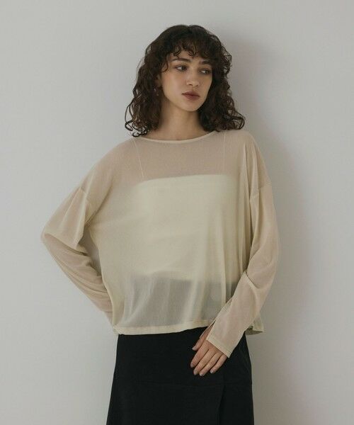 【Japan Fabric】 主役としてもレイヤードにも便利に使えるシンプルカットソー。チュールにフロッキープリントを施した、起毛感のある秋らしい生地でお作りした一枚。ドロップショルダーにゆったりとしたオーバーサイズシルエット、そして女性らしさを引き立てる程よい透け感が、エフォートレスな魅力を放ちます。浅めのV開きとやや横に広いボートネック、前後どちらでも使える嬉しい2WAY 仕様。袖先にはスリットを入れて、女性らしいニュアンスを感じられるデザインに仕上げました。