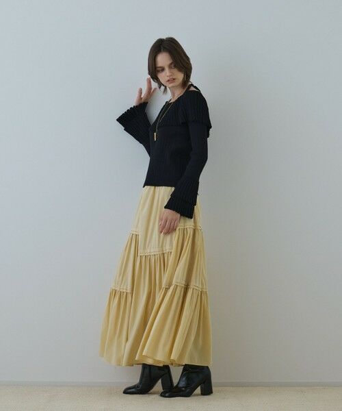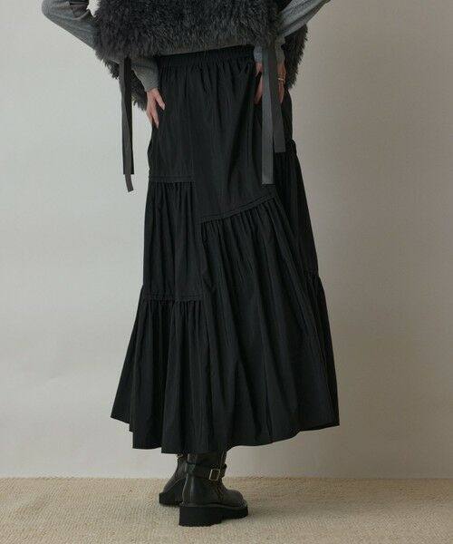 ナイロンポリエステルのタフタ素材を使用した、けまわしたっぷりのティアードスカート。 高さを替えていれたタック×ギャザーが凝ったデザインとなっております。 ※こちらのモデル着用画像はサンプル品を撮影しております。実際の商品と仕様、加工、サイズが若干異なる場合がございます。予めご了承くださいませ。洗濯表示洗濯不可 漂白不可 タンブル乾燥不可 アイロンは120℃まで 弱いドライクリーニング(石油系)可