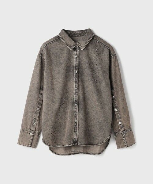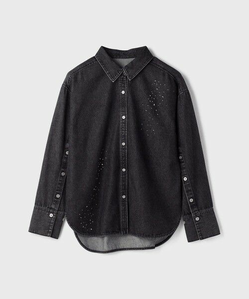 ビジューで魅せる、ワンランク上の華やかなデニムシャツ。7.5オンスのブラックデニム地に煌めくビジューを前身頃に大胆に入れた、カジュアルとフェミニンのバランスが美しく調和した一枚。ゆったりとしたシルエットながらラフ過ぎず、大人のカジュアルスタイルに品よく溶け込むデザインです。スリットスリーブの釦をあけるとケープ風にも着ていただける、モードなデザインに仕上げました。コーディネートの主役にぴったりなアイテムです。