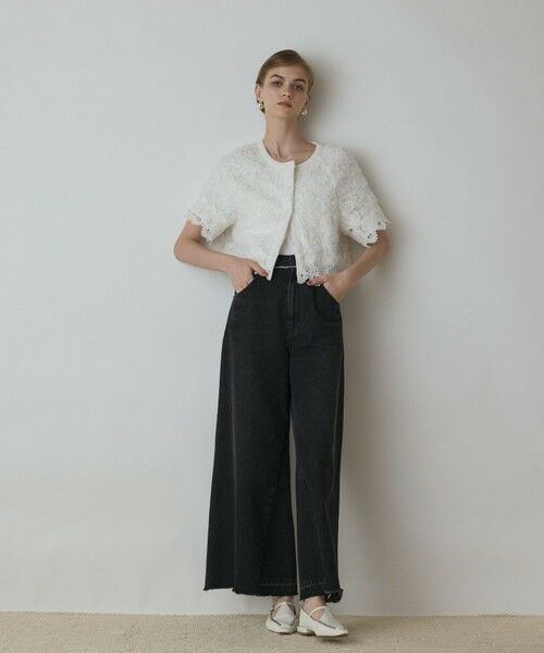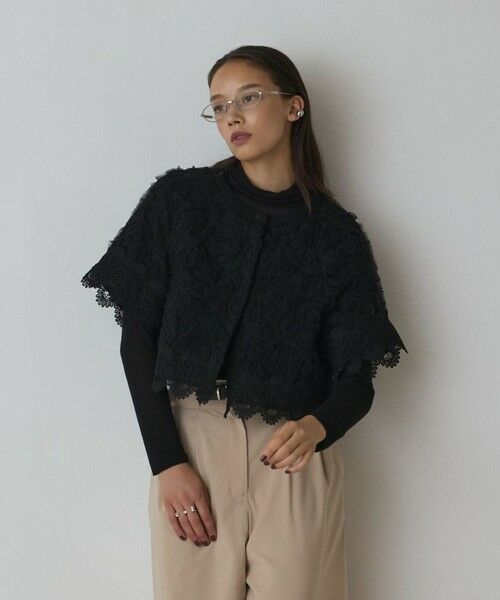 立体感のあるフラワー刺繍を重ねたニット素材のショートケープボレロ。 チュールにテープ刺繍とコード刺繍を施した、華やかなデザインに心惹かれる一枚です。袖口と裾はケミカルレースを使用し、スカラップで処理した美しい仕様。ふくらみを持たせてふわっとしたボリュームを出したニュアンス感が、特別な雰囲気を纏います。ゆったりとした身幅にややショート丈の今季らしいバランスシルエットもポイント。ライトアウター感覚で羽織れる、晩夏から初秋にかけてぴったりなアイテムです。