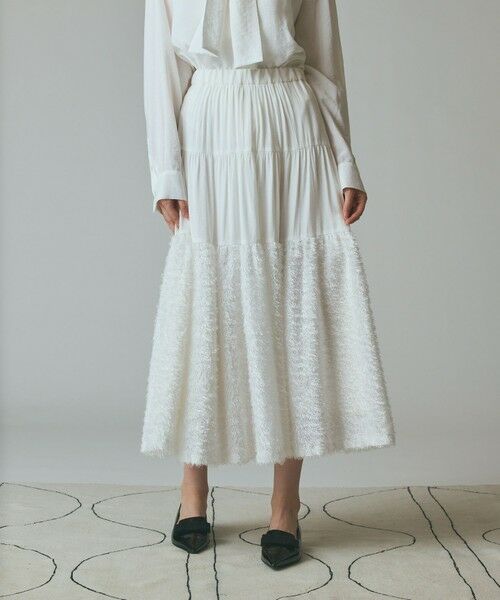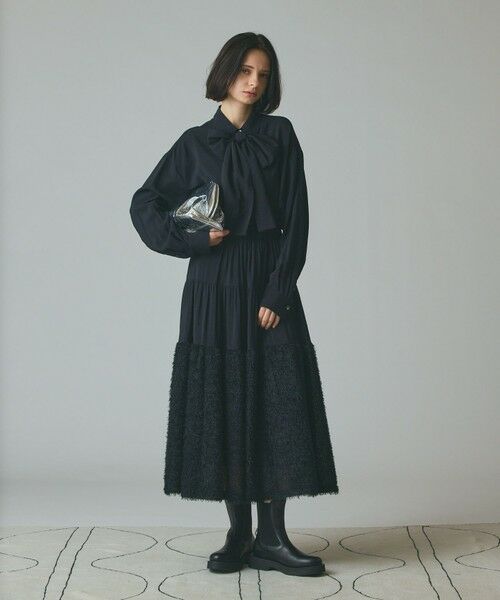 【Japan Fabric】 コーディネートが華やぐコンビネーションスカート。 シワ感のある独特な風合いのレーヨンナイロン素材に、毛足感の綺麗なフェザーヤーンを裾に切り替えた、秋らしい表情が魅力の一枚。フェザーヤーンを組み合わせた事で動きや立体感が生まれ、コーディネートに映える特別なムードを放ちます。お揃いでお作りしたボウタイシャツを合わせる事で、手軽にワンランク上のセットアップスタイルに。着合わせやすいベーシックカラーをご用意しました。