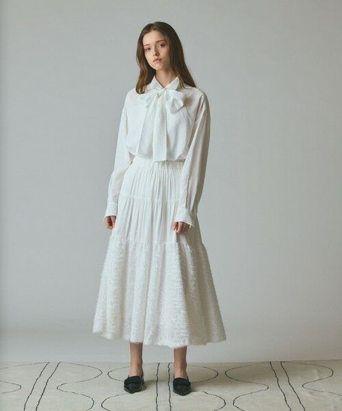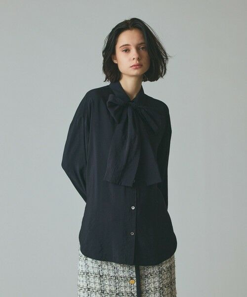 【Japan Fabric】 コーディネートが華やぐボウタイ付オーバーサイズシャツ。 シワ感のある独特な風合いのレーヨンナイロン素材と、大きめのボウタイが美しく調和した一枚。結ぶと上品な膨らみ感のあるボウタイは取り外しもでき、気分やシーンによって気軽にイメージをかえてお楽しみいただけます。お揃いでお作りしたスカートをあわせる事で、手軽にワンランク上のセットアップスタイルに。着合わせやすいベーシックカラーをご用意しました。