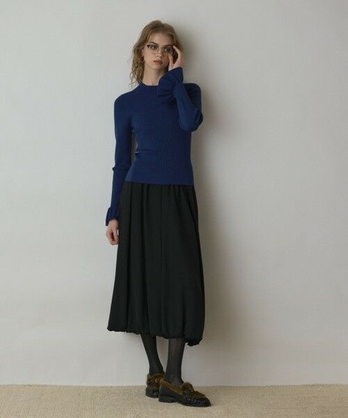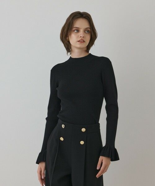 上品なハイネック仕様に袖口にはフリルディテールを施して、さりげないフェミニンさをプラスしました。着回しやすいベーシックカラーに加え、大人のアクセントカラーにぴったりな深みのあるブルーの4色展開です。