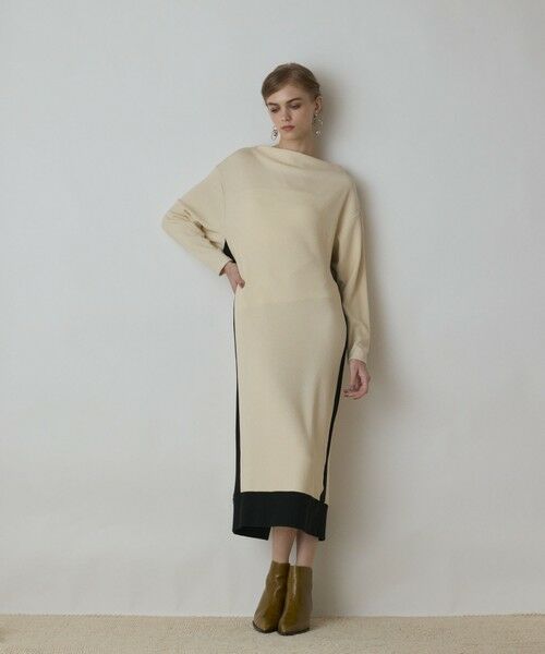 Diagramらしいモードなバイカラーデザインがポイントのワンピース。 ストンとしたストレートシルエットで、ボディラインを拾わず楽に着て頂ける大人に嬉しい一枚です。そのままストレートで着ても可愛いですが、ウエストベルトを締めてメリハリをつけたシルエットを楽しむのもおすすめ。着心地の良い伸縮性のある素材で衿ぐりも伸びるため、肩を落としたオフショルダースタイルで楽しめるのもポイントです。バックスリットを施し、女性らしい抜け感と共に足さばきにも配慮しました。ウエストベルトは、キナリにはキナリ、ブラウンにはブラック、ブラックにはブラックのお色のベルトが付属します。