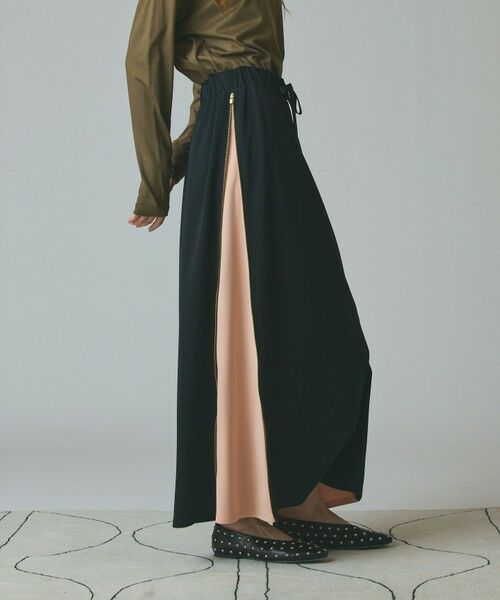 【Japan Fabric】 デイリースタイルに馴染む、大人のロングスカート。上品な光沢感と落ち感の綺麗なトリアセジャージ素材を使用。織物にはないしなやかさと軽さがあり、綺麗めにもカジュアルにも着回しできる一枚に仕上げました。両サイドについたファスナーを開ける事でバイカラーのマチが覗き、シルエットを調節できる遊び心溢れるデザインです。 太めのリボンを添えたウエストドロスト仕様で、先端にはメタルのアクセントをプラス。ラフな雰囲気がありつつも、アーバンムード漂うディティールがポイントです。お揃いでお作りしたジャケットとのセットアップスタイルもおすすめです。