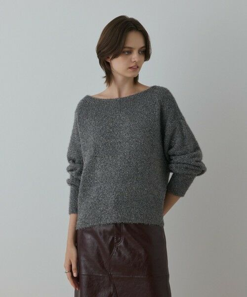 毛足の長い上質なフェザーヤーンでお作りしたニットトップス。繊細なグリッターがきらりと煌めき、装いを華やかに印象付けます。程よいハリ感と落ち感がありつつ非常に柔らかな肌あたりで、大人にも優しい着心地の良いニットに仕上げました。やや横に広い女性らしいボートネックに素材を引き立てるシンプルなデザインが、どんな装いにもスマートに馴染むポイント。身幅に余裕をもたせたゆったりとしたドルマンシルエットで、大人のカジュアルスタイルに品よく溶け込む一品に仕上げました。力の抜けた女性らしいエフォートレスな着こなしを楽しめる一着です。
