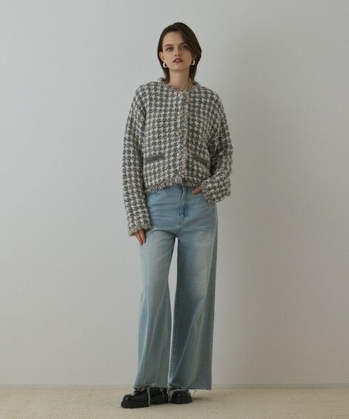 カラフルなネップ糸をきかせたツイード編地のカーディガン。あえて前立てを付けたジャケット仕立てのクラシックなデザインと愛らしいミックス糸が一際目を惹く、コーディネートの主役を飾る一枚。千鳥格子をイメージした編地にカラフルなネップを入れた多様な意匠糸を活かして、全面に入れたフリンジテクニックもジャケットに華やかさをプラス。セミフォーマルやオフィスカジュアルなどにはもちろんの事、コンサバ過ぎない為デニムなどのデイリーアイテムとの好相性。お揃いでお作りしたカーディガンを合わせたアンサンブルスタイルもおすすめです。