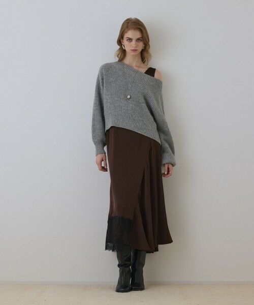 着まわし自在、ワンピースとニットがセットになったアイテム。モヘヤ混素材の片畦ニットトップスは、肩を落としたワンショルダースタイルでも楽しめるゆったりとしたニュアンスシルエット。前をやや短めに設定してワンピースとバランス良く着ていただけるデザインに仕上げました。ワンピースは、しなやかなサテン生地に裾にランジェリーレースを組み合わせたアシンメトリーディティールの女性らしい一枚。それぞれ単品でも着て頂けますが、セットで着る事でバランス良く上品な装いを楽しめるのが魅力です。秋の気配を感じさせる落ち着いたカラーもポイント。旬なレイヤードスタイルを楽しめる一品です。
