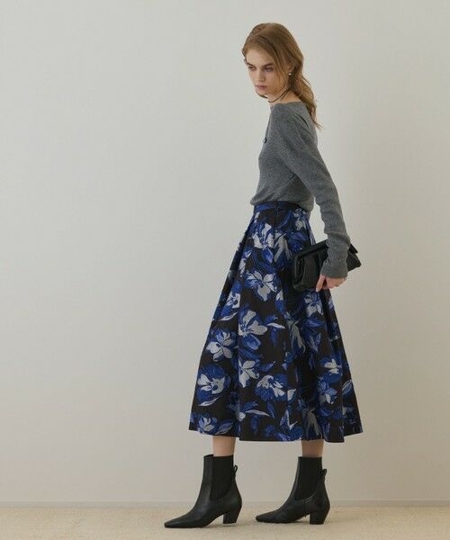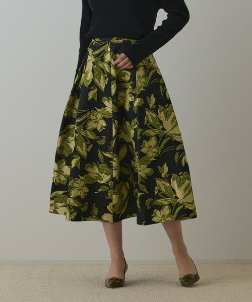 【Japan Fabric】 国内で一からオリジナルで作った、立体感のあるジャガード素材仕立てたタックフレアスカート。華やかさと重厚感、そしてクラシックな雰囲気が美しく調和した、他にはない大きなフラワー柄が魅力。美しいカラーのコントラストを表現するため、国内の工場でジャガードの中でも特殊な織りによって立体的に浮き出るように柄を描いています。イエローはブラックベース、ブルーはダークブラウンベースに柄をのせており、表情が異なるのもポイント。ハリ感と程よい落ち感のある素材を活かし、タックとパターンでフレア感を表現した女性らしいシルエット。タックをイレギュラーに入れることで柄に動きを出し、素材の華やかさを引き立てるデザインに仕上げました。 秋はさらっとニットに、冬はアウターに合わせて、華やかな秋冬のスタイリングをお楽しみください。