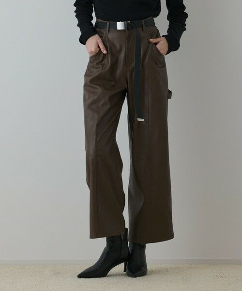 トレンドスタイルを叶える、大人のフェイクレザーパンツ。程よいムラ感がこなれた印象のフェイクレザーを使用。緩やかなカーブを描く構築的なシルエットが、コーディネートをおしゃれにブラッシュアップしてくれます。ゆとりのあるワイドシルエットながらも、ルーズになりすぎない絶妙なシルエット。後ろの裾に入ったドット釦で丈の調整も可能です。定番として着回しやすいブラックとブラウンの2色をご用意しました。