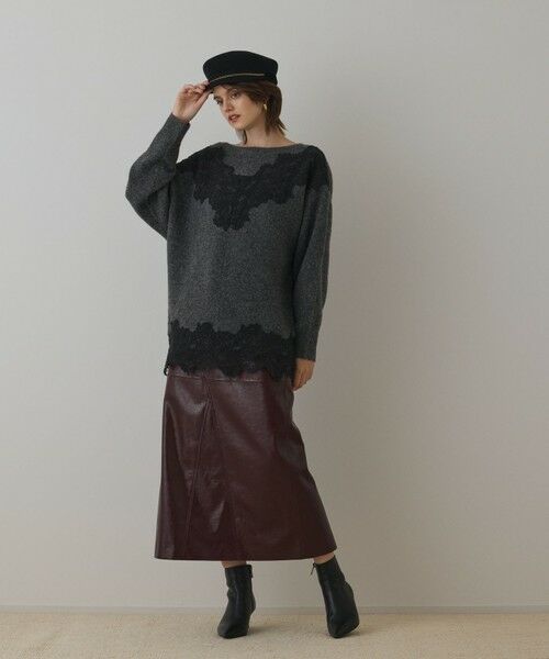 コーディネートを品よく華やかに演出してくれるニットトップス。裾と、肩から胸元にかけて大胆ながらも繊細なレースを施した、リュクスな表情のデザインです。ゆったりとしたリラックスシルエットに、デコルテが綺麗に見えるやや横に広い衿ぐりで、女性らしいニュアンスを感じられる一枚に仕上げました。主役としての存在感を放ちつつモノトーンで纏める事で、華美過ぎない大人な表情に。定番兼主役としてワードローブに加えたくなるアイテムです。