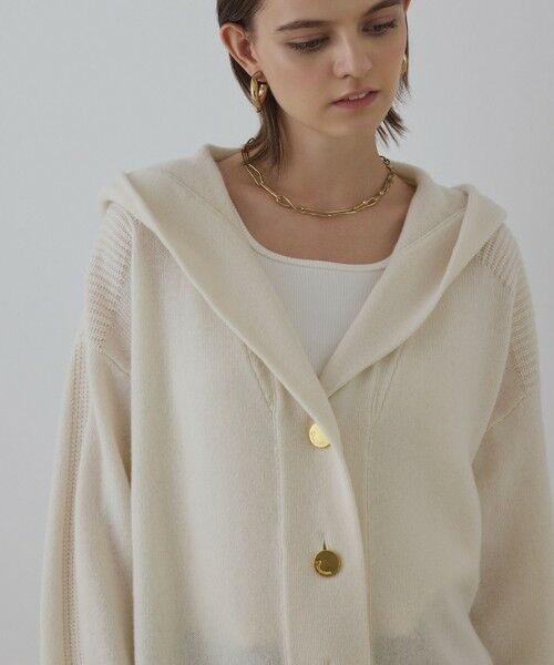 シーズンスタイルにぴったりなフード付きのニットカーディガン。 上質なウール100%の糸を、程よい肉感のミドルゲージで丁寧に編み立てた上品な表情の一枚。裏毛とは異なる大人のニュアンス感が、装いをぐっと新鮮な表情に魅せてくれます。ゆったりとしたリラクシーなオーバーサイズに、大きめのメタルボタンとロゴプレートが洗練感をプラスし、アーバンムード漂うデザインに仕上げました。フードをアウターの中に入れて楽しむ事も可能。洗練度の高い大人のニットトップスを、この機会にぜひ。