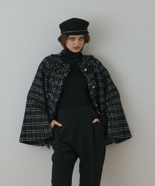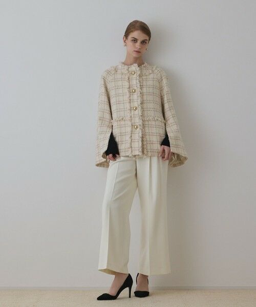 【Japan Fabric】 いつもの装いを上品にまとめてくれる、エレガントなツイードジャケット。リボンヤーンやラメ糸を使いオリジナルで作成した華やかなファンシーツイードを使用。国産の高級感溢れる生地を使用する事で、永く愛用するに相応しい一品に仕上げました。ケープ風の旬なスリットスリーブや首周り・前立てなどにフリンジを施して、コンサバ過ぎなず日常使いしやすいデザインに。抜け感溢れるゆったりとしたサイジングにゴールドのボタンをアクセントに効かせた、アーバンムード漂う一枚。ご自身へのご褒美に、特別なプレゼントに、自信を持っておすすめしたい大人の女性の為のスペシャルコートです。