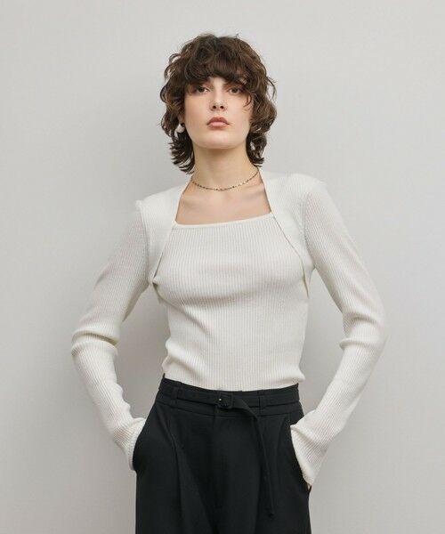ラメ撚糸のウール混素材。 レイヤードディテールのリブニットトップス。 ※こちらのモデル着用画像はサンプル品を撮影しております。実際の商品と仕様、加工、サイズが若干異なる場合がございます。予めご了承くださいませ。