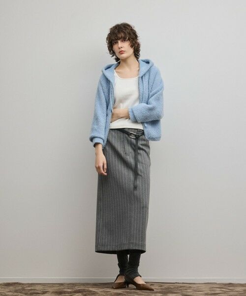 ラメフェザーヤーンとストレッチ糸を接結編みしたニットパーカー。 程よくハリ感があり、ニット地でもシルエットが綺麗に出るのがポイントです。フードに添えた紐も同素材でする事で、ミニマルで洗練された印象に。大人のニュアンススタイルにぴったりなチャコールと、冬から春にかけてぴったりな爽やかなサックスブルーの2色をご用意しました。
