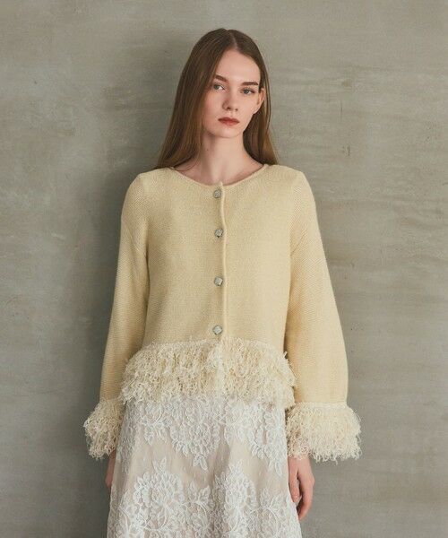 ホリデーシーズンを上品に彩るニットカーディガン。上質感のある柔らかなウールアンゴラ混の糸に繊細なラメを織り込んだ、光の反射でさりげなく光る姿が印象的な一枚。ボタンはビジューボタンを採用し、アクセサリーのように煌めく華やかなデザインに仕上げました。袖口と裾にリボンとフェザーヤーンでボリューム感のあるフリンジを施して動きを持たせ、甘さを抑えてモード感のあるデザインに。お揃いでお作りしたスカートを合わせた、ワンランク上のセットアップスタイルもおすすめです。