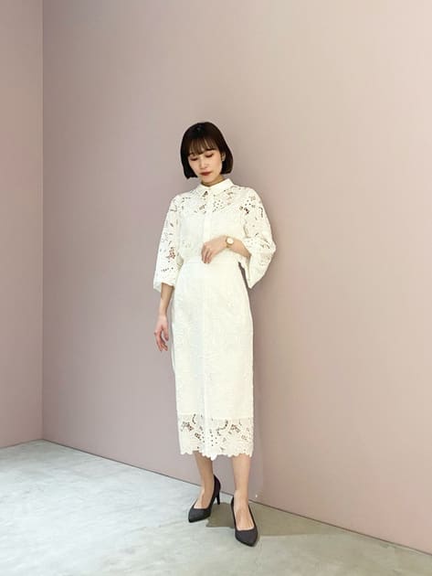 全面レース素材のセットアップです。襟付きのブラウスにタイトスカートで綺麗めな印象になります。 タイトスカートは腰回りスッキリで、身体のラインが出過ぎずに綺麗にご着用頂けます。大柄のレースの為、肌も透けすぎずに上品な印象です◎