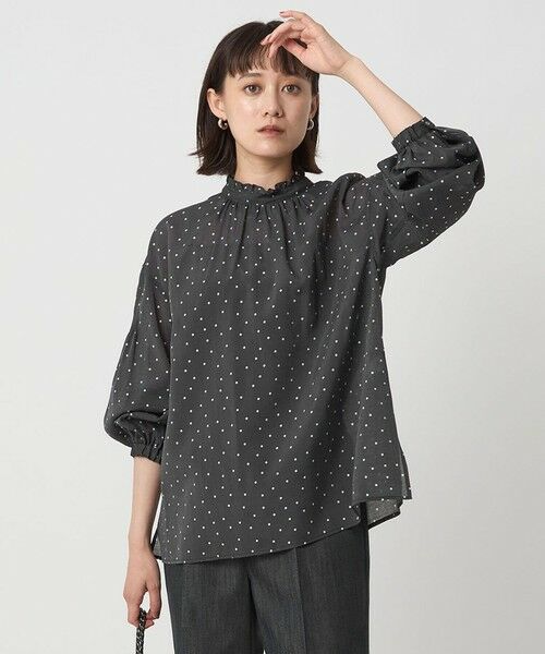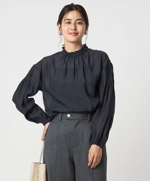 首元のフリルデザインが大人フェミニンな印象のブラウス。