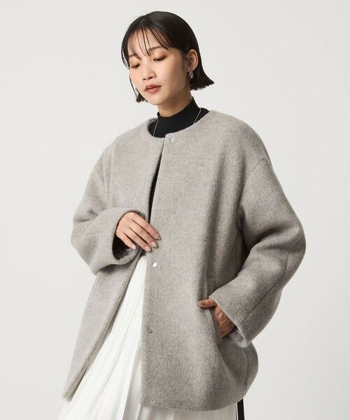 ノーカラーデザインなのでタートルネックやハイネックのアイテムと好相性。