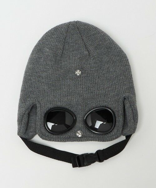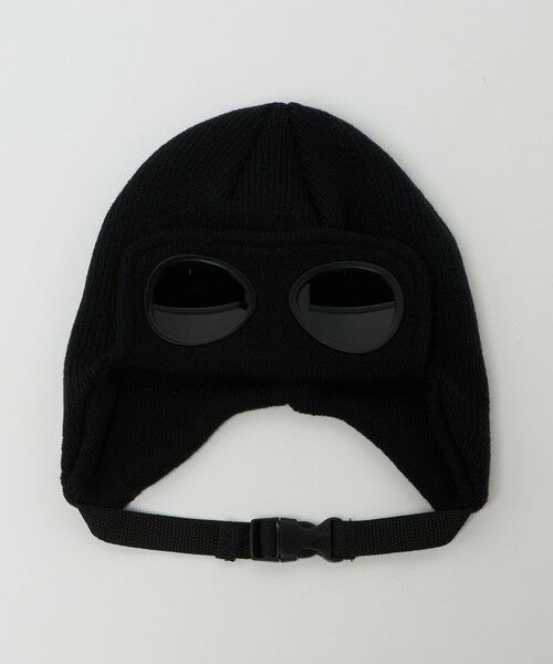 ツバをおろして着用するとなんとゴーグルになるバックル付きニットキャップ。