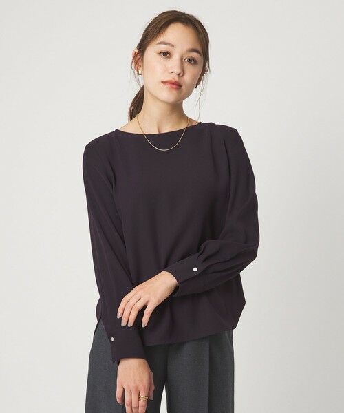 シンプルながらも、袖口のタックがほどよい立体感を演出するクルーネックブラウス。