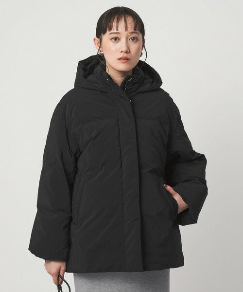 スカートでもパンツでも合わせやすく、着回しのきく丈感のダウン。