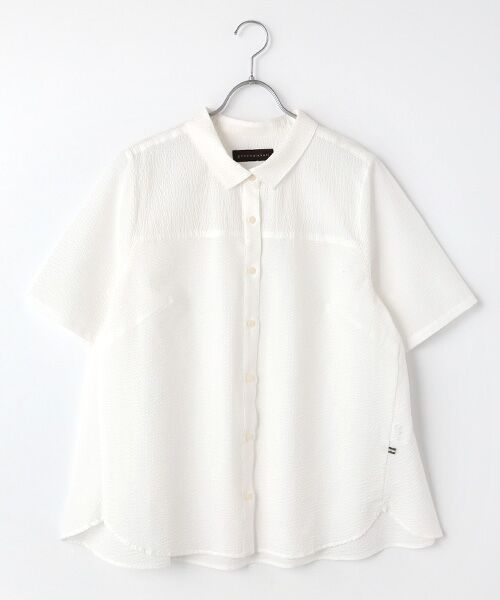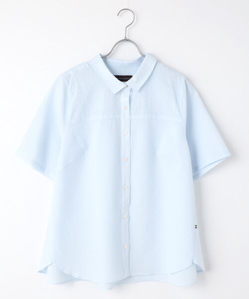 凹凸が特徴のサッカー生地を使用。凹凸が有ることで肌に触れる面積が少なく、べたつきにくいです。ノンアイロンでお手入れも簡単です。シンプルなレギュラーカラーシャツのシルエットを少し肩を小さく裾に向かって広がるAラインにすることで女性らしい仕上がりです。