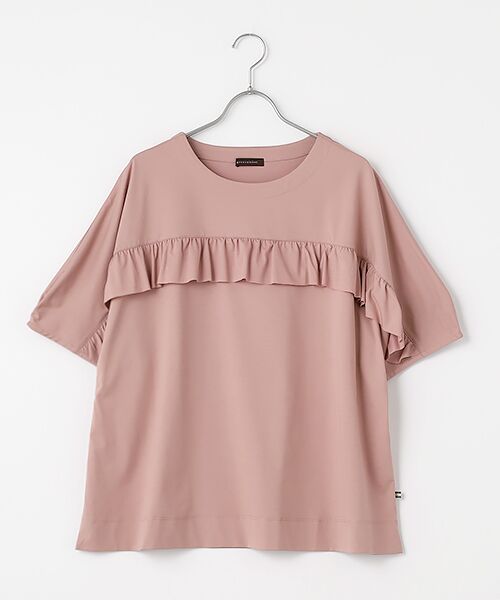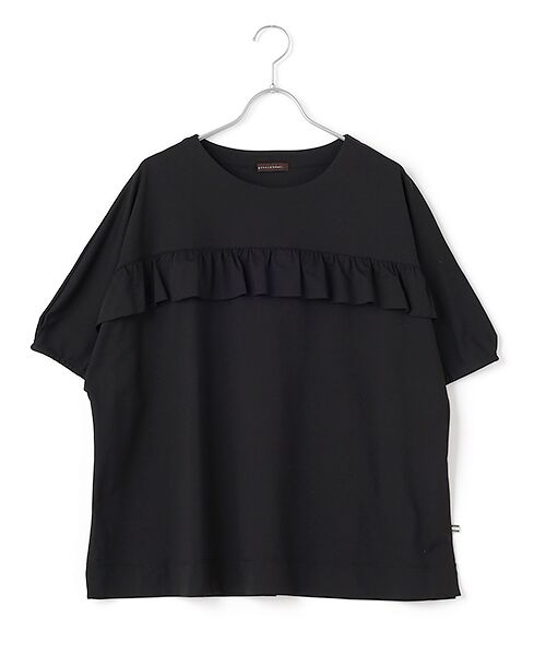 接触冷感の天竺生地を使用したデザインカットソー。胸の部分を切り替えて共地のフリルを挟み込みました。袖口部分で邪魔にならないようにフリルの端を丸くカットしています。袖口の袖山部分に小さなタックを入れ外側にはねない様にしています。ワイドパンツやスカートに合わせやすい着丈にしています。