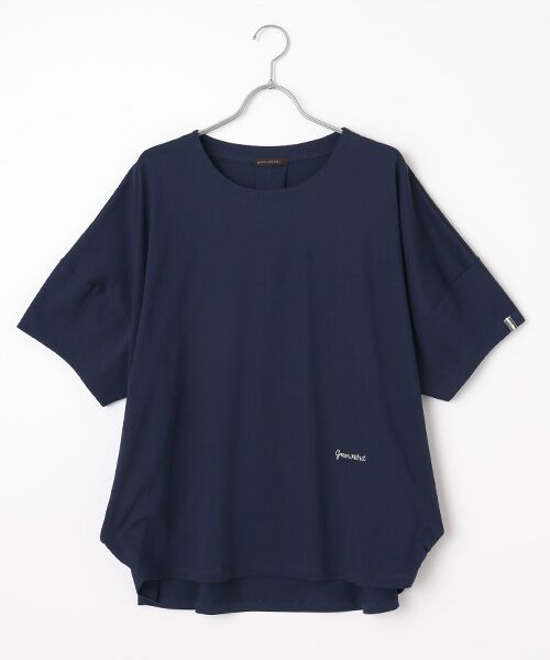 柔らかく落ち感の有る接触冷感の天竺生地を使用。袖は立体的に仕上がるようにカーブにしています。裾部分にタックを入れ全体的なシルエットを複雑に立体的にしています。シルエットに拘った一枚でさまになるTシャツです。