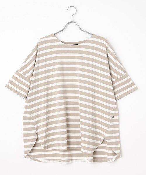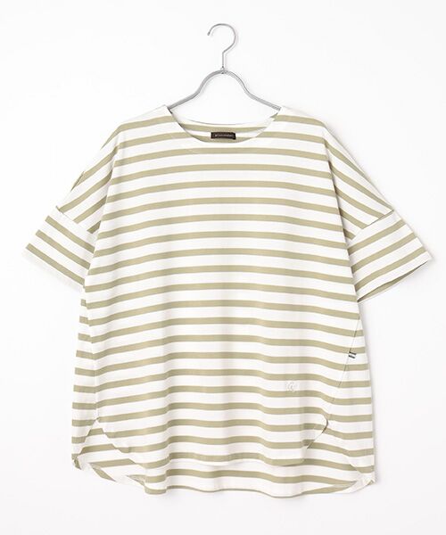ゆったりとしたサイズ感のボーダーTシャツ。スモーキーで涼しげなライトカーキとサンドベージュのボーダーは、ぬけ感がありおしゃれな仕上がりです。丈は長めなのでヒップラインをカバーしてくれて安心です。左裾にGN刺繍入り。