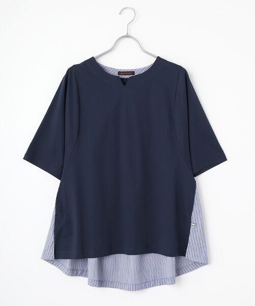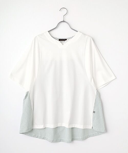 ゆったりとしたデザインTシャツ。後ろ身頃にポリエステル混のストライプ生地を使用。シワになりにくいので洗いざらしでOK.きちんとした印象なのでお仕事にも使いやすいです。ベースの生地は接触冷感の天竺を使用しているので涼しく快適にご着用いただけます。