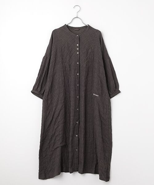 ポリエステルコットンの薄くて軽いシャーリング生地を使用。ダークなカラーで秋まで使えるシックな仕上がりです。ノンアイロンは嬉しいポイント。七分袖で前あきのワンピースは軽いアウター代わりにも使える2Way。袖口袖下部分にはゴムが入っているので着用中のストレスが有りません。ヨーク部分の地の目を変えて全体に動きを出しています。左前身にgreen noutの刺繍がきらりと光ります。