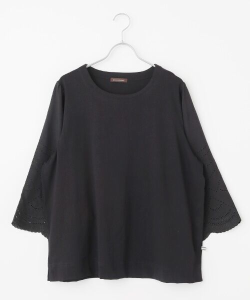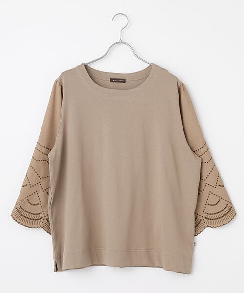 柔らかい風合いの40/2天竺を使用。袖部分にはポリエステルのトロピカル生地を使用し、オリジナルのスカラップ刺繍を施しました。1枚でさまになるカットソーはまだまだ暑いこの季節に便利です。肌寒い日にはインナーに長袖を合わせても素敵です。5701601と合わせてセットアップにしてもかっこよいです。