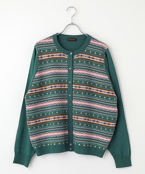 風合いが柔らかなアクリルナイロンウールを使用。どこか懐かしい雰囲気の有るトラディショナルなフェアアイルカーデ。柄の部分はダブルジャカードなので裏面に糸が渡ってなく、綺麗です。裾リブ上に入ったお家柄がキュートです。