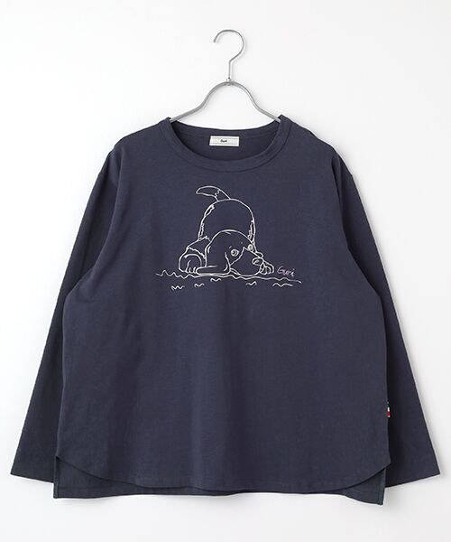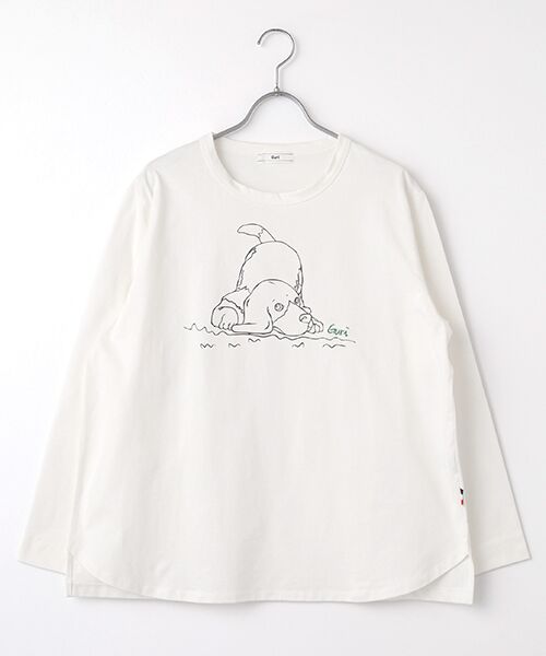 表面が綺麗な40/2天竺を使用。Guriの上目遣いがキュートなプリント入り。単色プリントなので大人っぽい仕上がりでコーディネイトもしやすいです。配色で入れたGuriの文字は刺繍にしてポイントにしています。脇には太めの幅のトリコロールテープを挟み込んでいます。