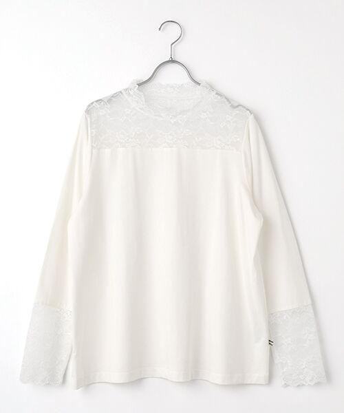 モダール混の薄手のベア天を使用。滑らかな肌触りで伸縮性もよく心地よい着心地です。重ね着をした際に見える部分に伸縮性のあるレースを使用しています。シャツやカットソー、ニットのインナーとしてご着用頂くとレース部分がちらっと見えてコーディネイトのポイントになります。